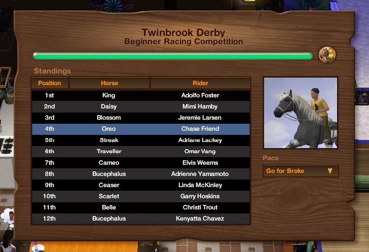 Chase and Oreo placed 4th in the Twinbrook Derby. No trophy but he won 100 Simoleons and plans to buy some carrots for Oreo.