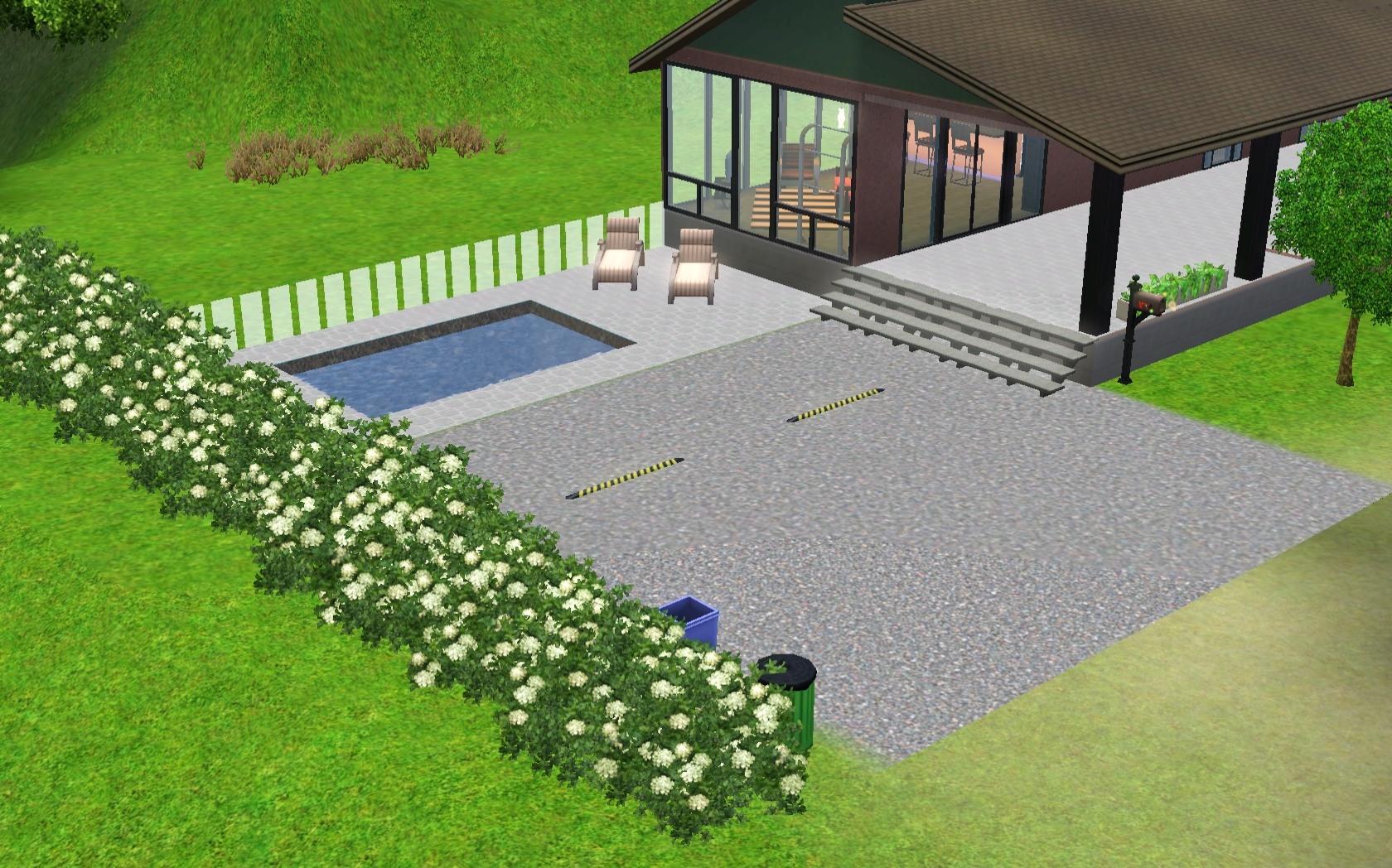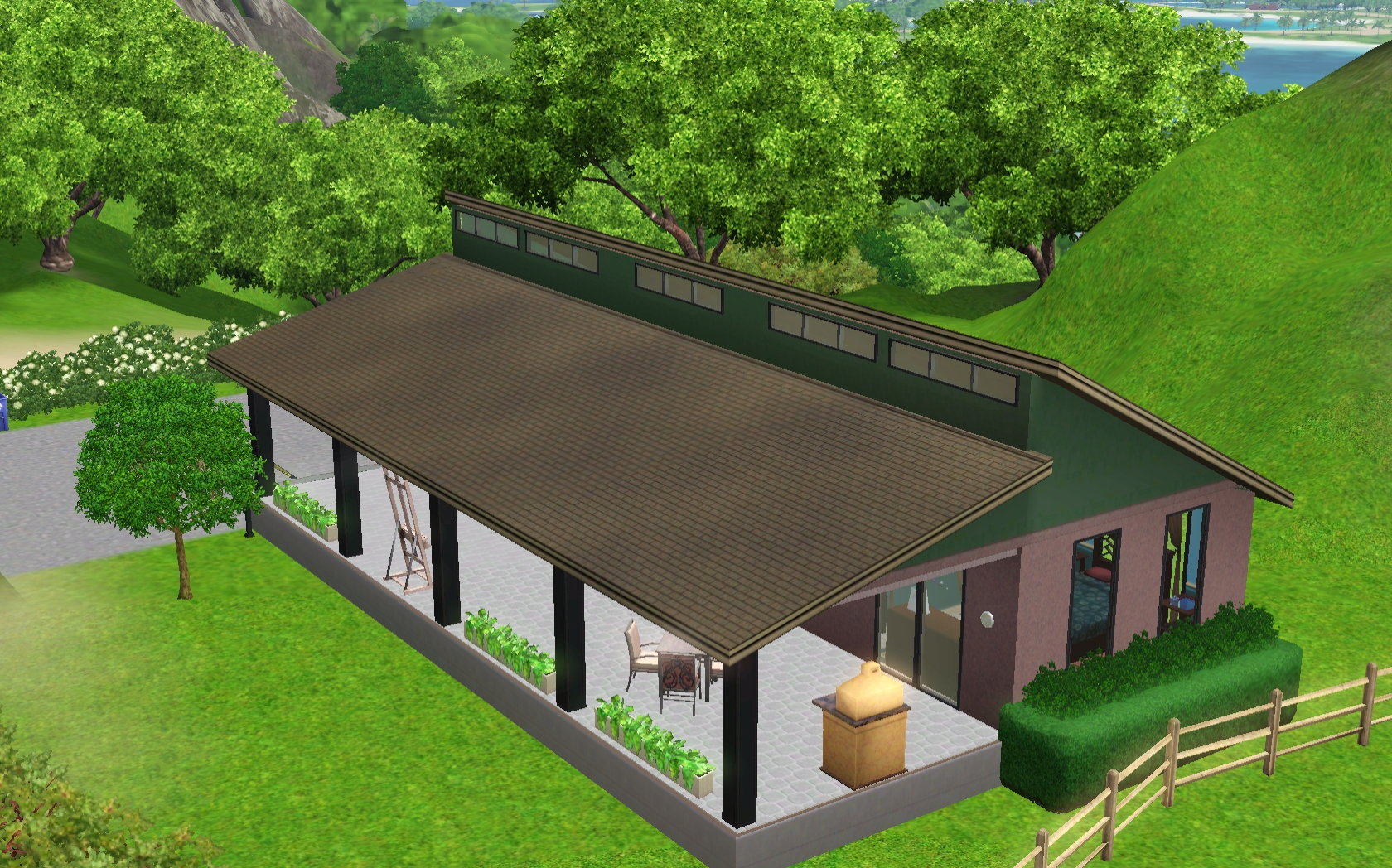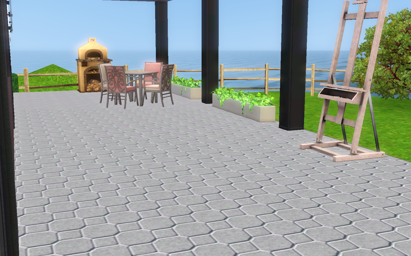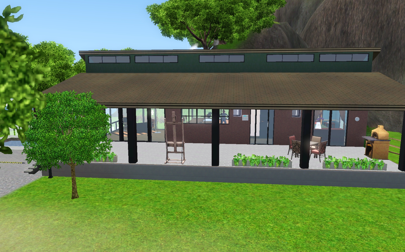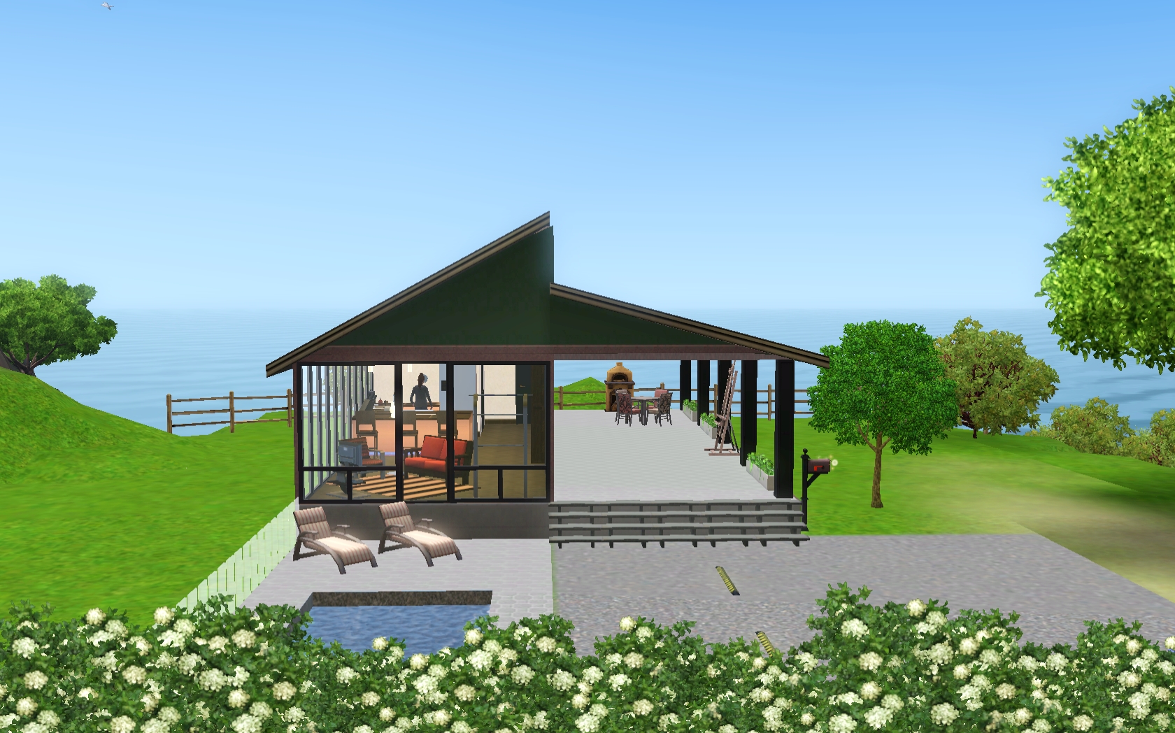 Love the way you did the roof line, and that you have just nice outdoor seating and a wood-burning oven! I also love the wood floors, all the greenery, and the nice pool area! I’m going to have to make a Partridge and move the sim in so I can have a Partridge and a pear tree.