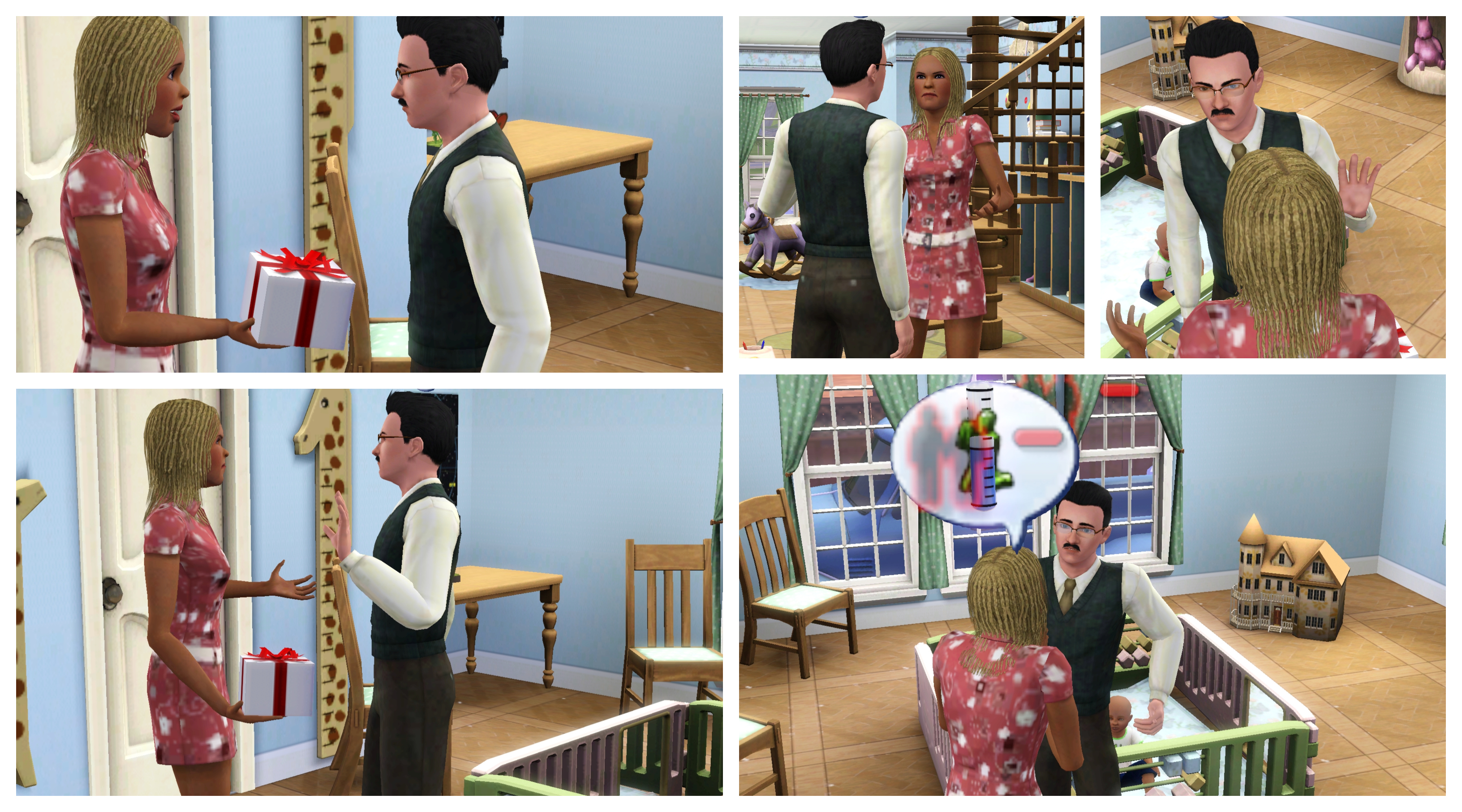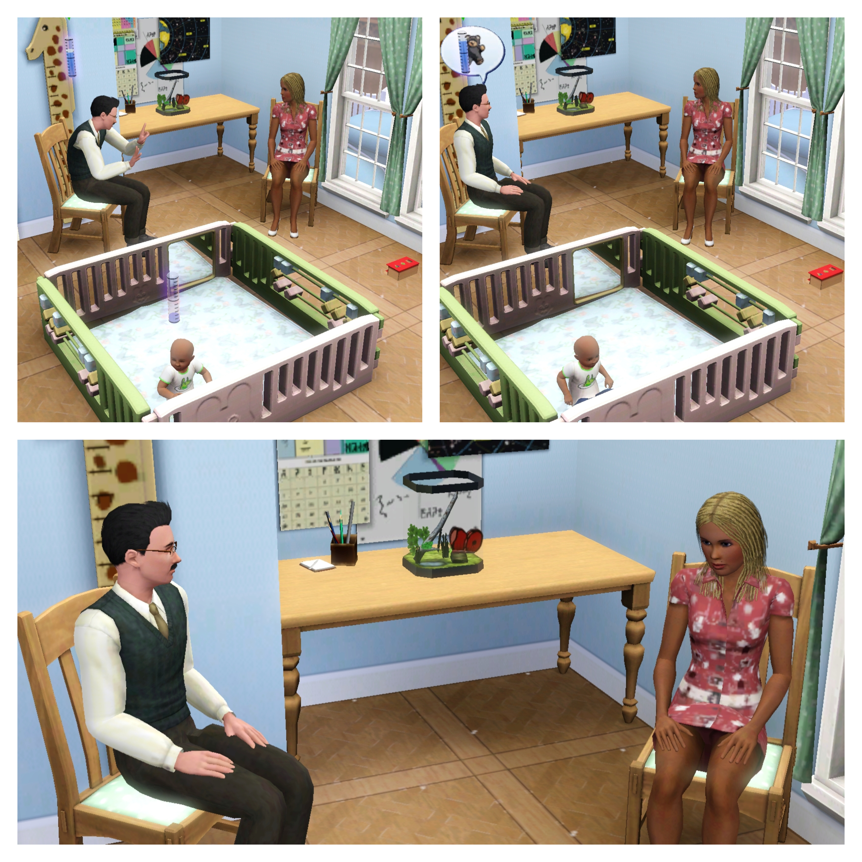 Fiona called during breakfast, asking about toddler books … mainly the Toddler Simstein series. Charles let her know that while they might be entertaining, the company claims of increasing intelligence and improving learning ability hasn’t been proven. Then he asks if she’s heard anything about trees being tampered with. Fiona hasn’t but will keep an eye out and let him know.