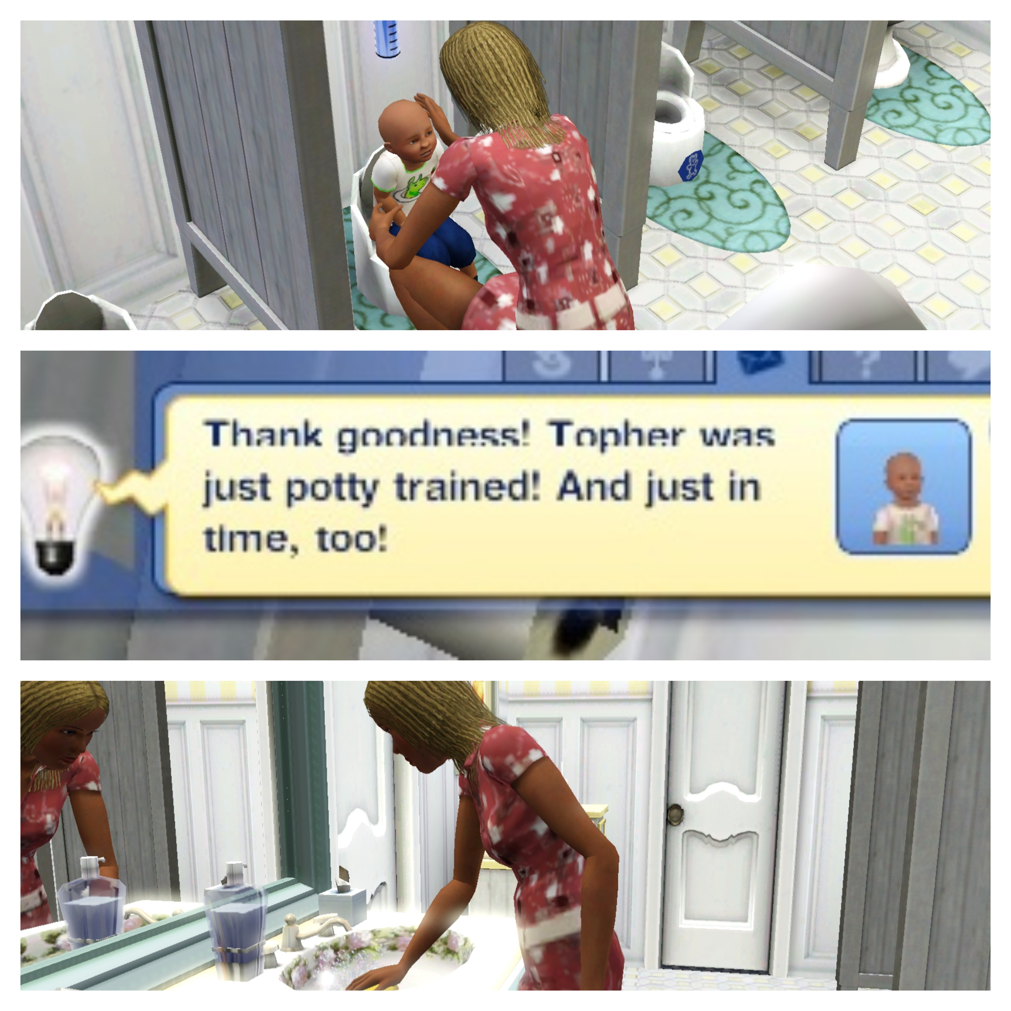 Topher now knows how to use the potty and Becky is pleased with how smoothly training went (he only had one accident). It will take longer to clean the bathroom but she doesn’t mind because it means no more diaper changes for him. Hooray!