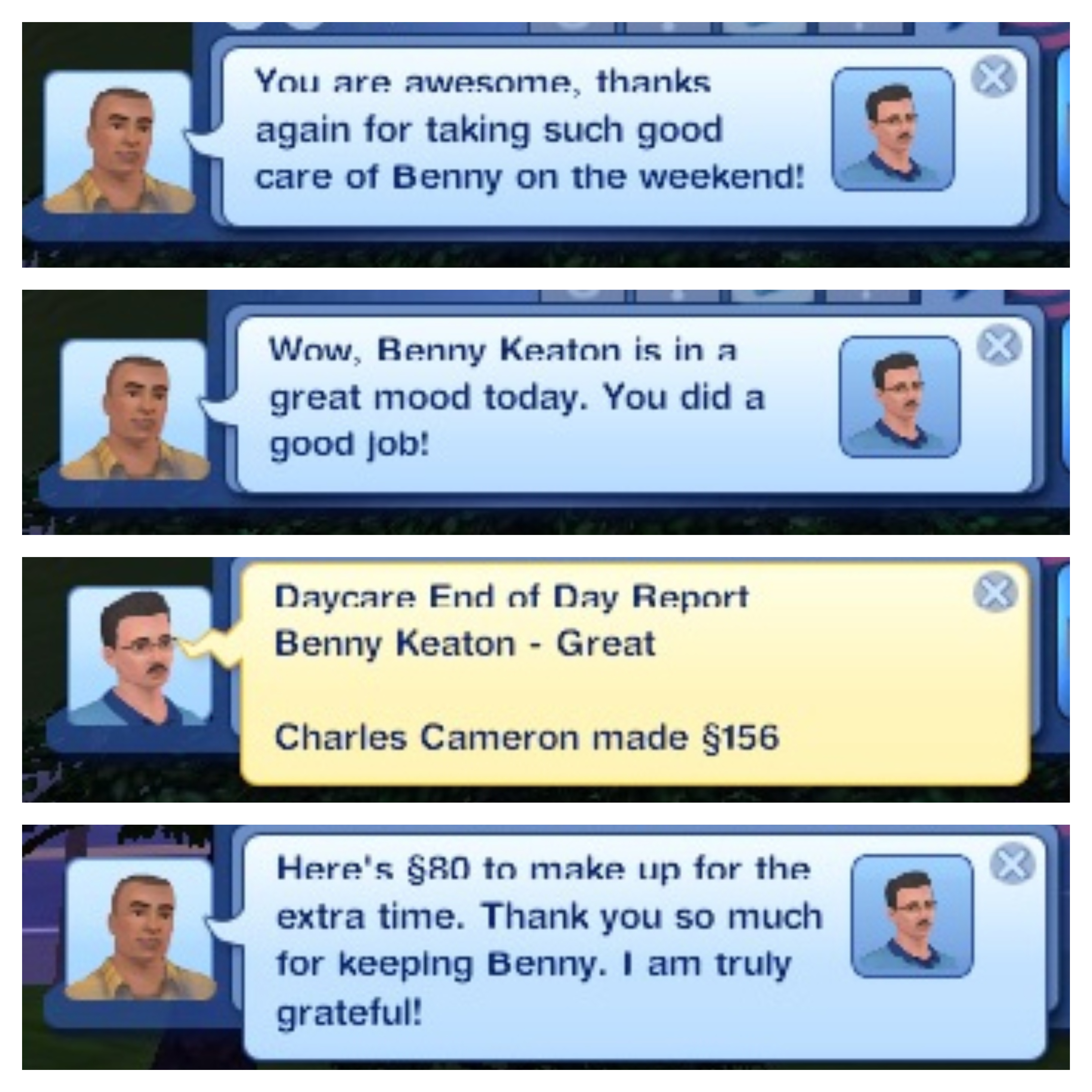 Charles receives glowing compliments regarding Benny’s care and the extra pay is nice, too!