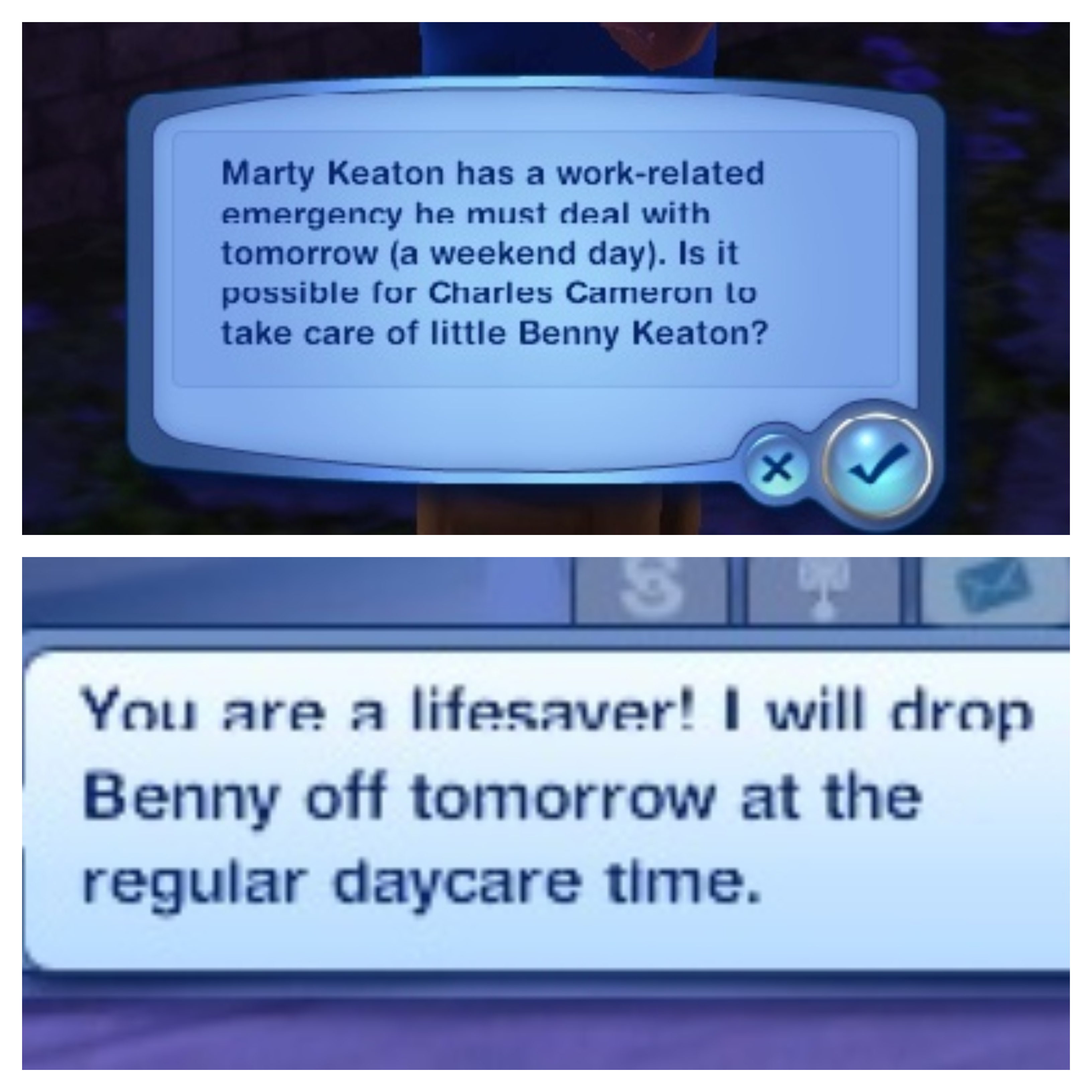 Something has come up and they need Charles to watch him again tomorrow. Marty is pleased when Charles agrees.