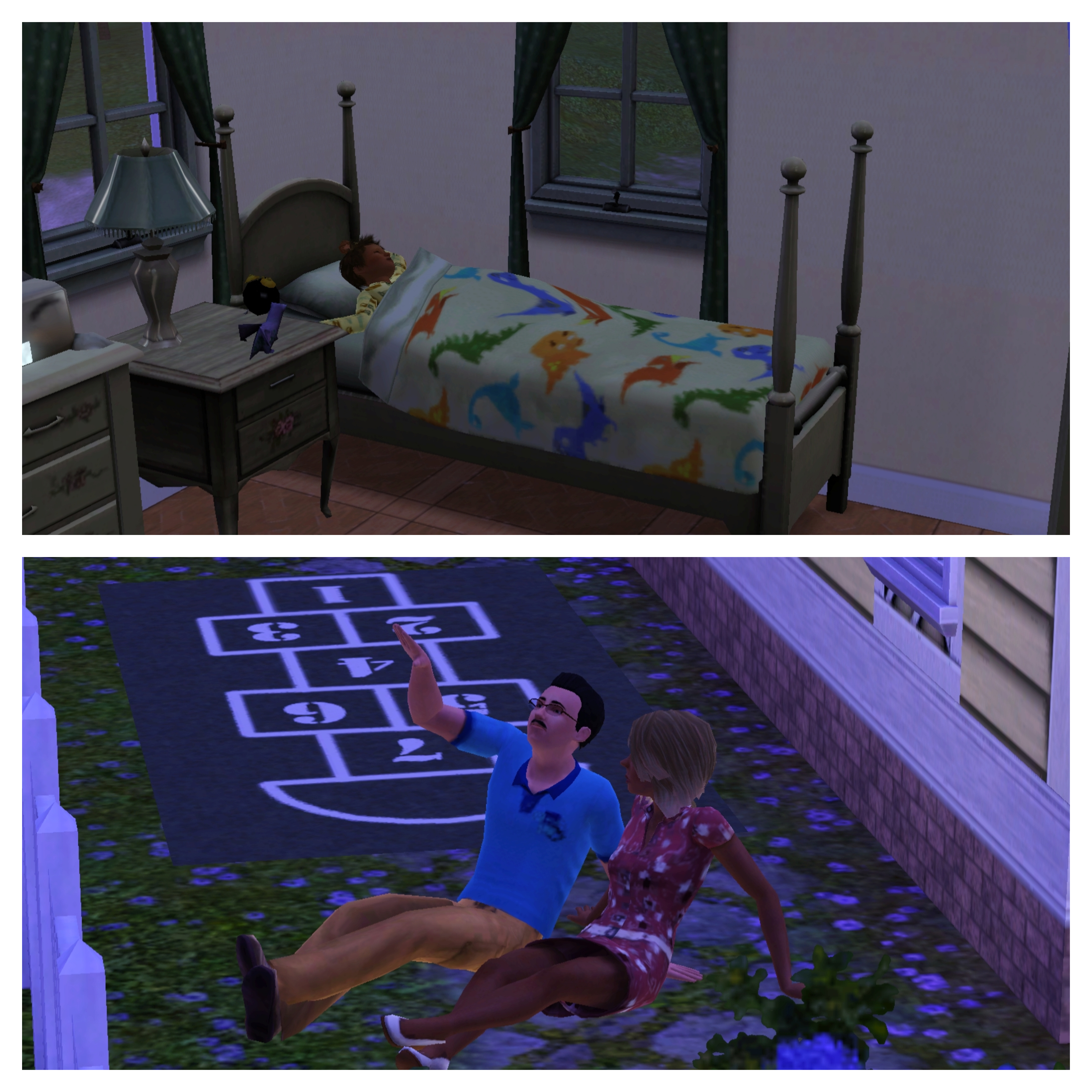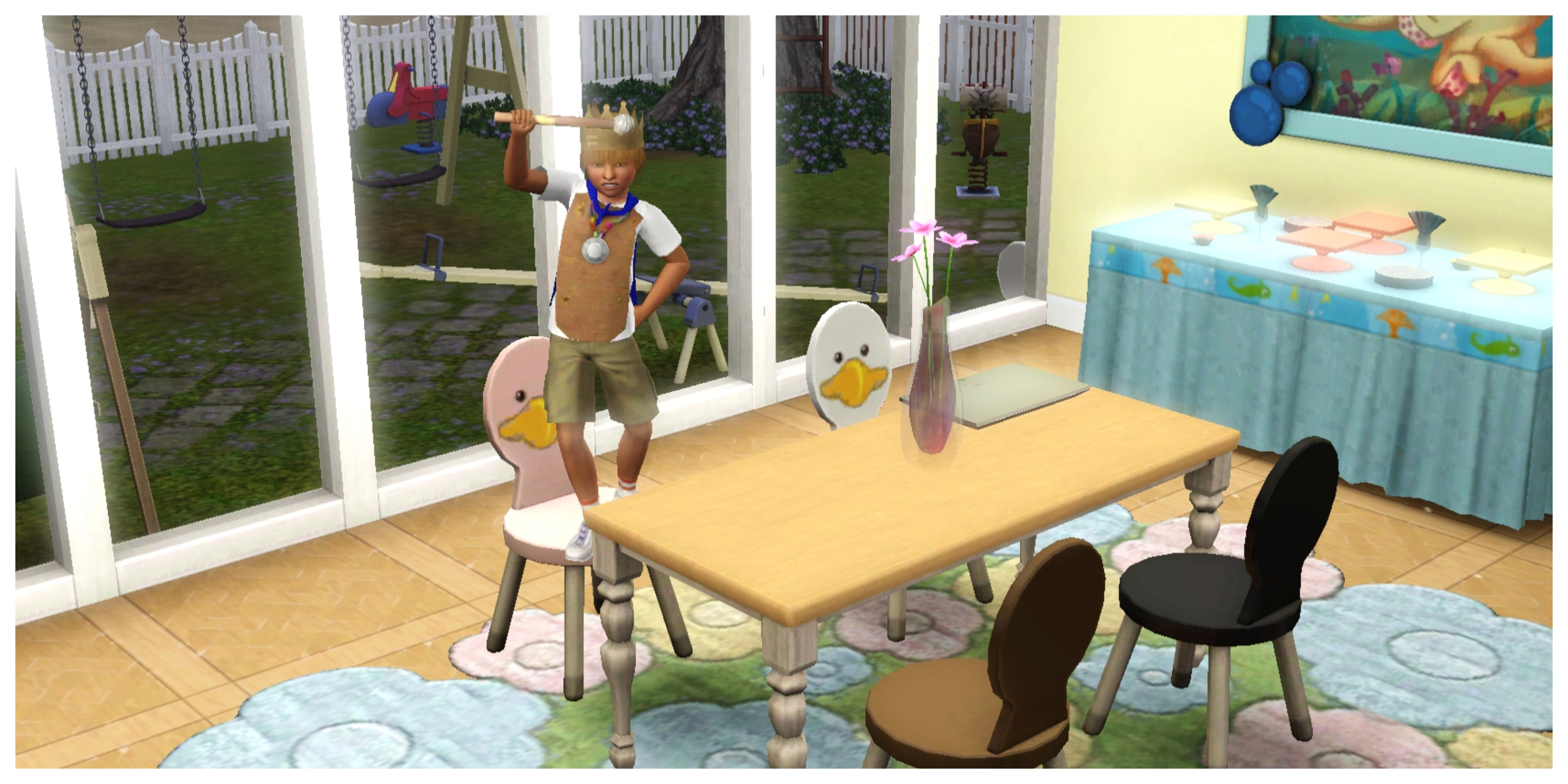 Becky works in the garden while Charles rocks Benny nearby. Topher plays with his new friend, Mortimer Goth, until the rain sends Mortimer home and the rest of them scurrying back inside.
