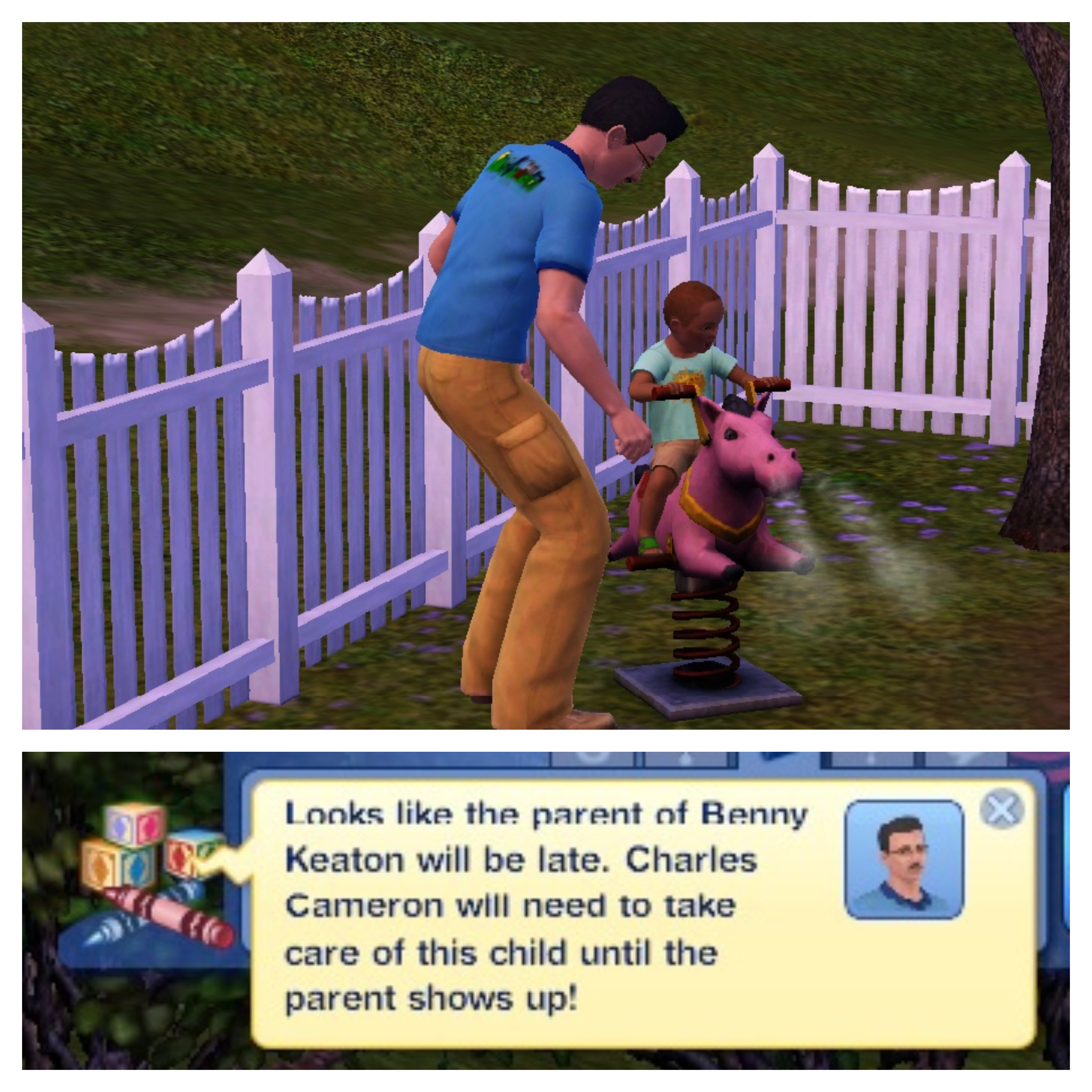The rain stops and Charles takes Benny outside where he gets a message letting him know that Benny’s parent will be late. “Benny, you have time for another pony ride!” “Wheee!!!”