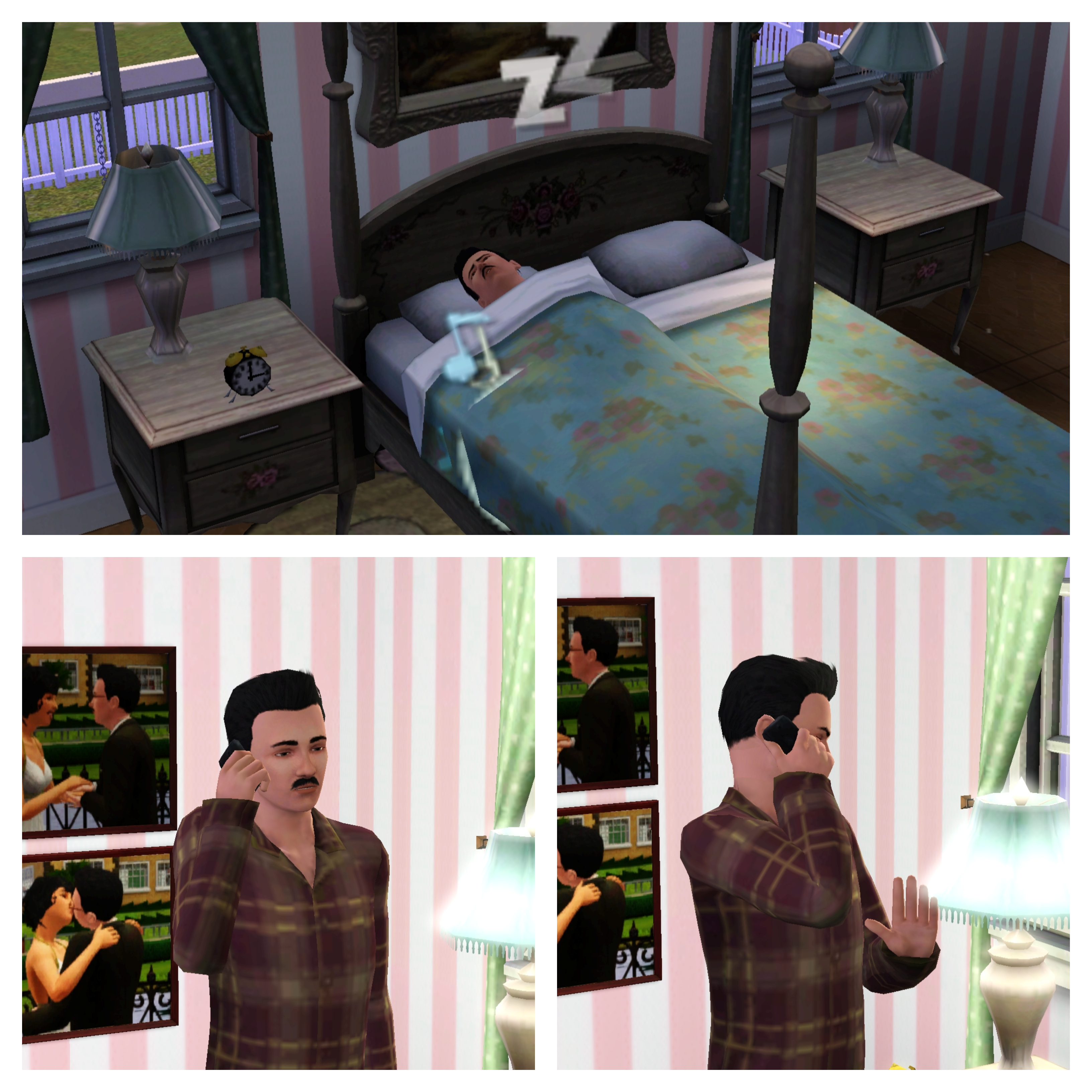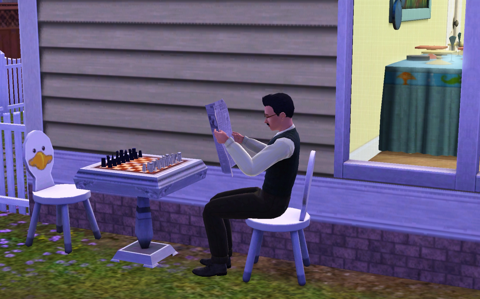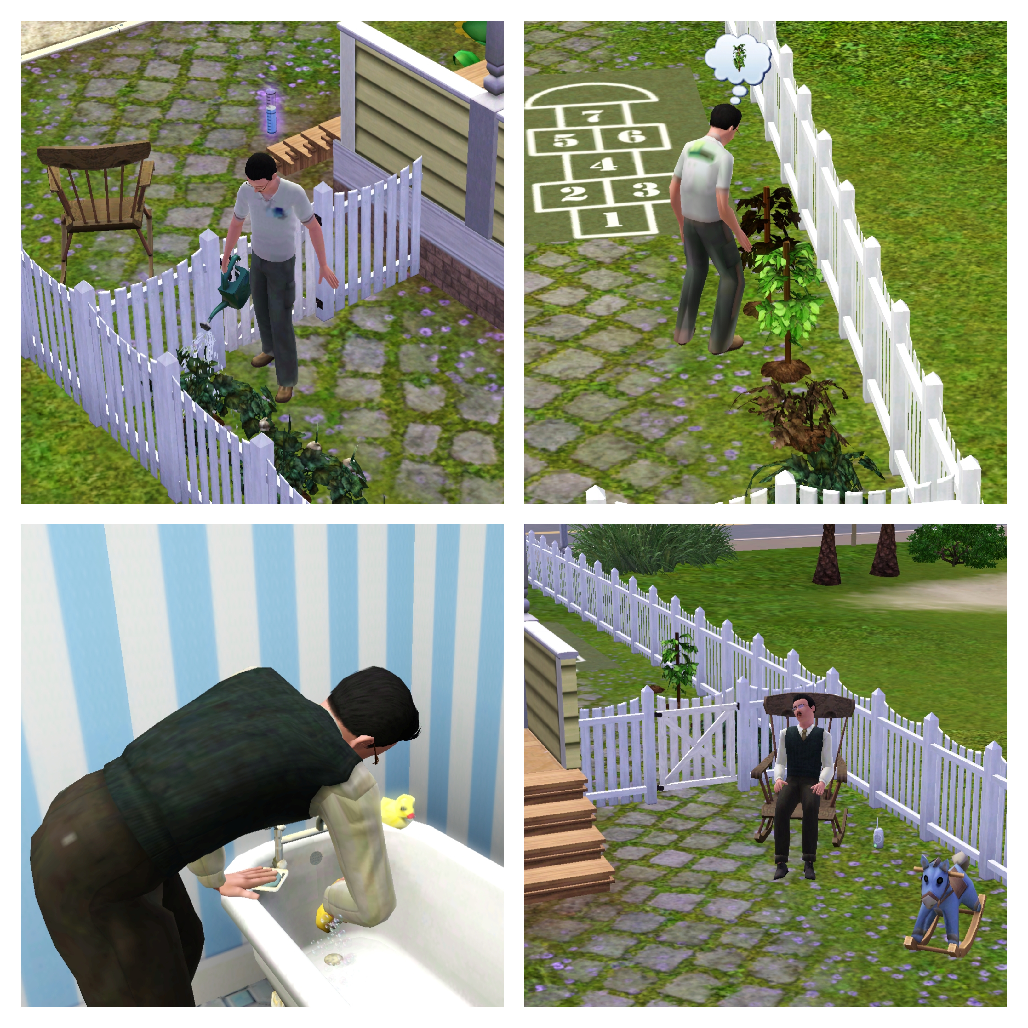 Charles wakes and heads out to the garden. Obviously, he has a lot on his mind and doesn’t notice that he dressed in his work uniform on a day off! A few plants need replacing and by the time he is done, a bath is next on his list. “Charles, my good man, you positively reek!” After bathing, he cleans the tub and tackles a few other chores before taking a brief break. Brief … Zzzzz ….