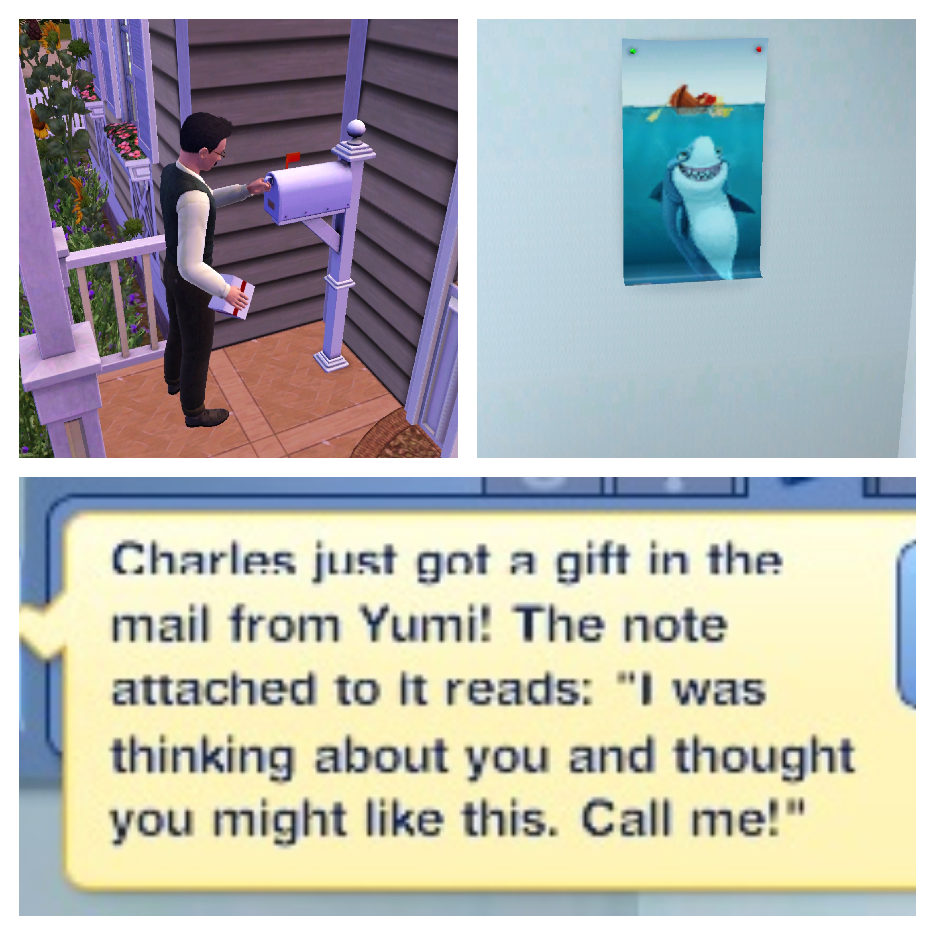 To say that Charles was a bit surprised at receiving a gift in the mail is an understatement. Mrs. Sekemoto, Sam’s grandmother!, wrote: “I was thinking about you and thought you might like this. Call me!” The poster of the grinning shark under the boat fills him with chills. “Not appropriate for children and certainly not appropriate for her to be sending to me!”