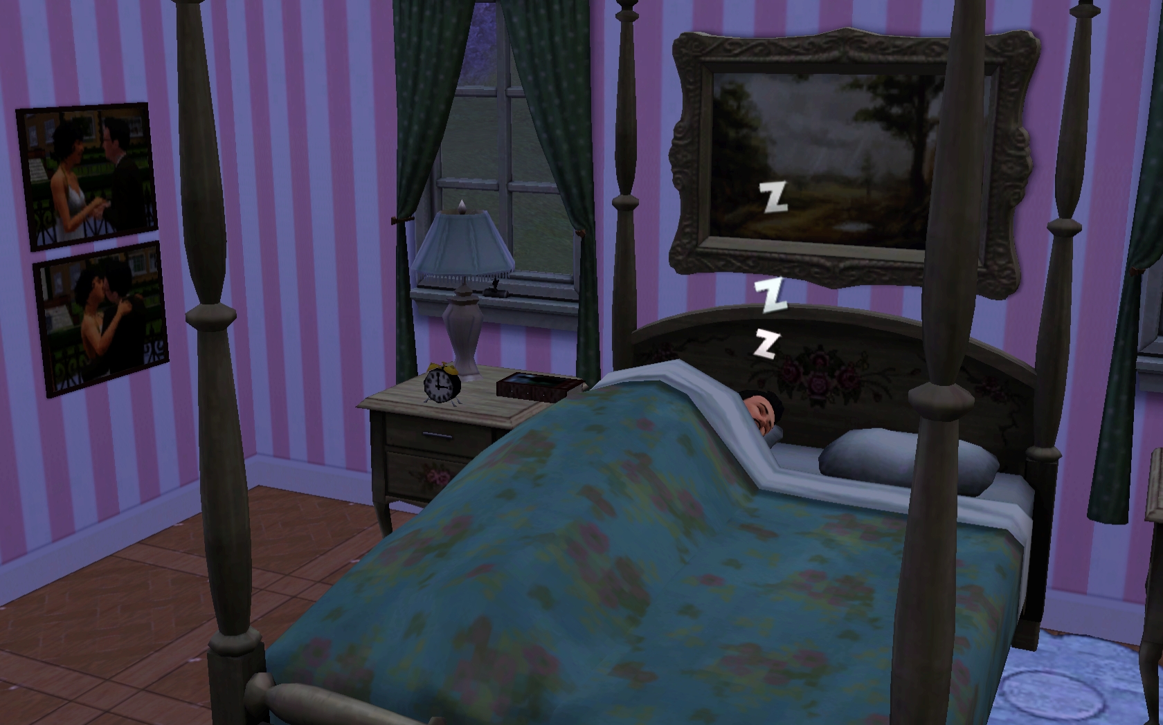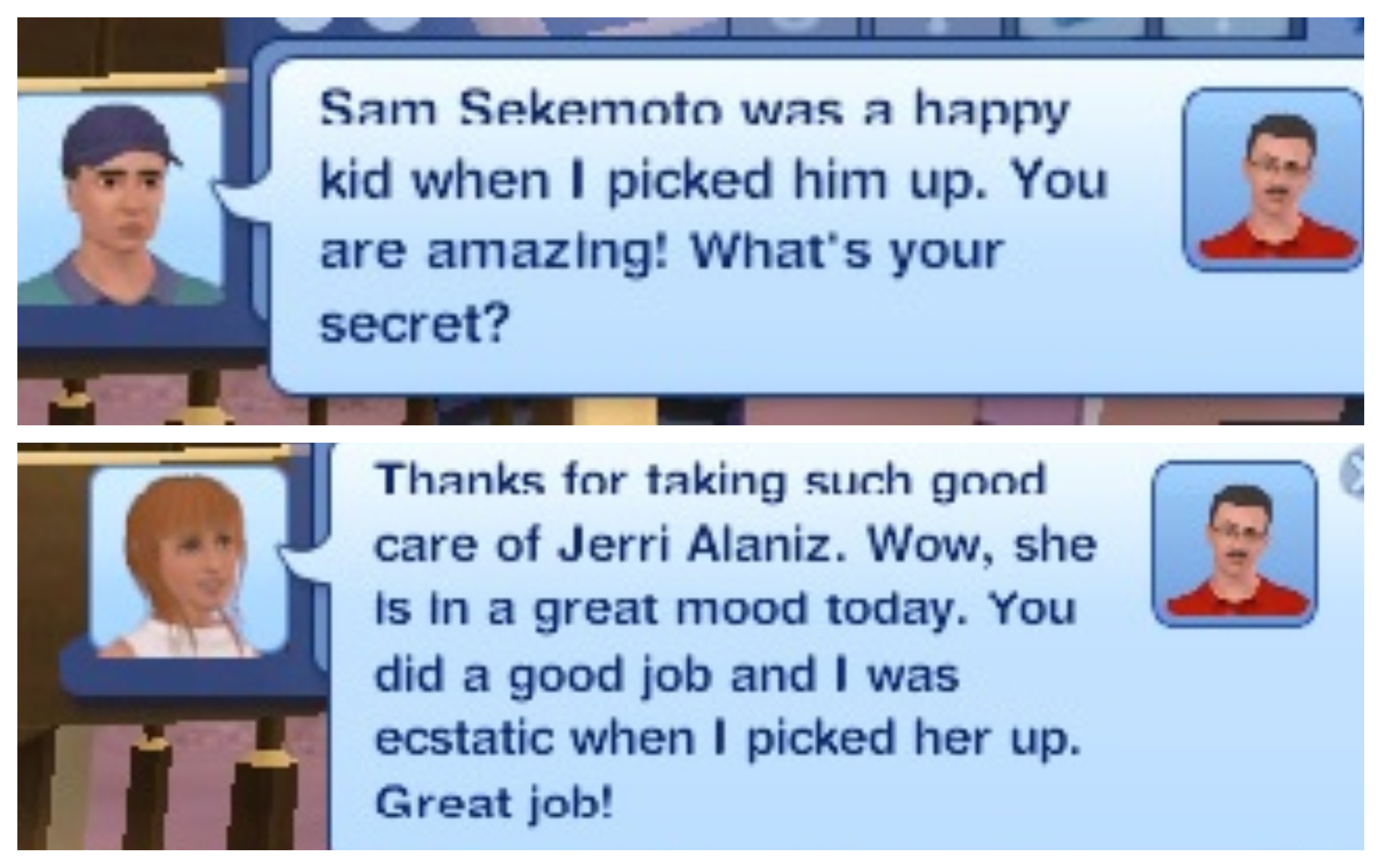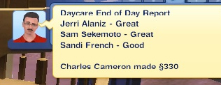 What?! Somehow in the blink of an eye, Sandi dropped from great mood to good. Not only did he not get a compliment, he was also dinged in pay. 30 Simoleons. OUCH!