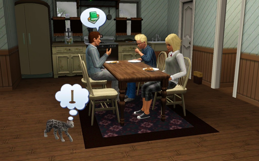 Zep heads inside to clean his claws and passes the family eating breakfast. There are no interesting smells coming from their plates and the conversation seems somewhat serious.