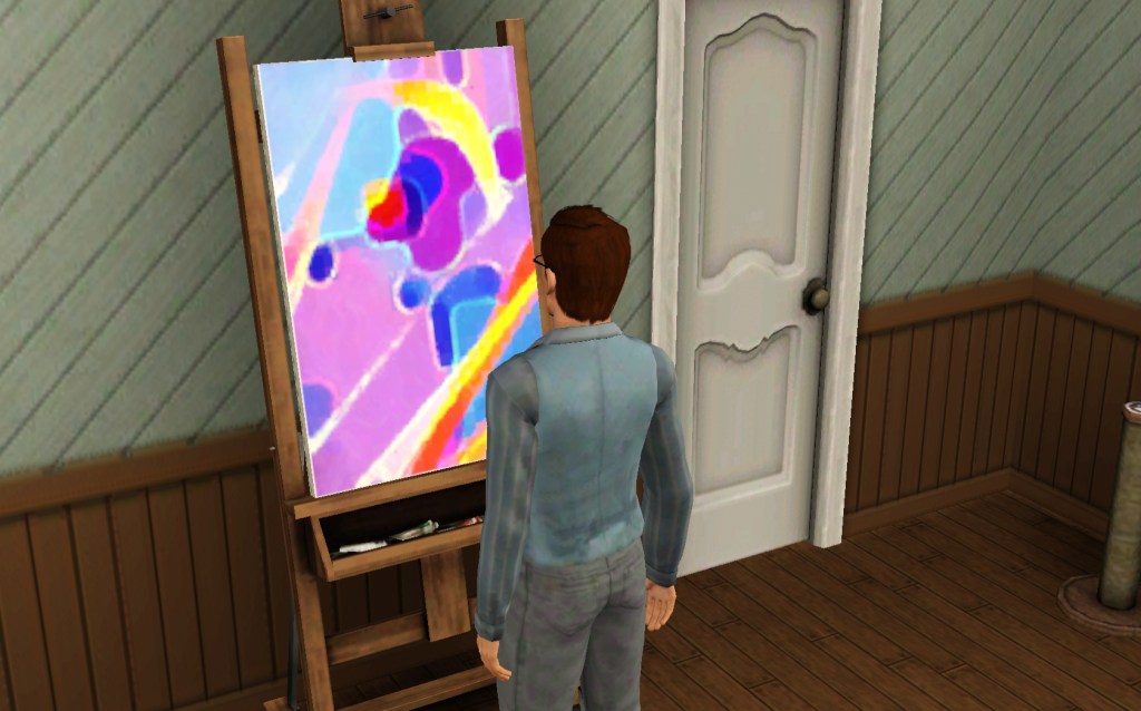 As for Tad’s painting style, he has the artistic trait which would cause paintings to have a “watercolor effect, making it blurry” according to this Sims 3 Wiki: https://sims.fandom.com/wiki/Painting