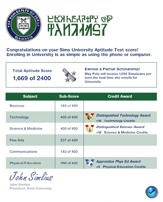 She then takes the college aptitude test and is pleased with her results so decides once is good enough.